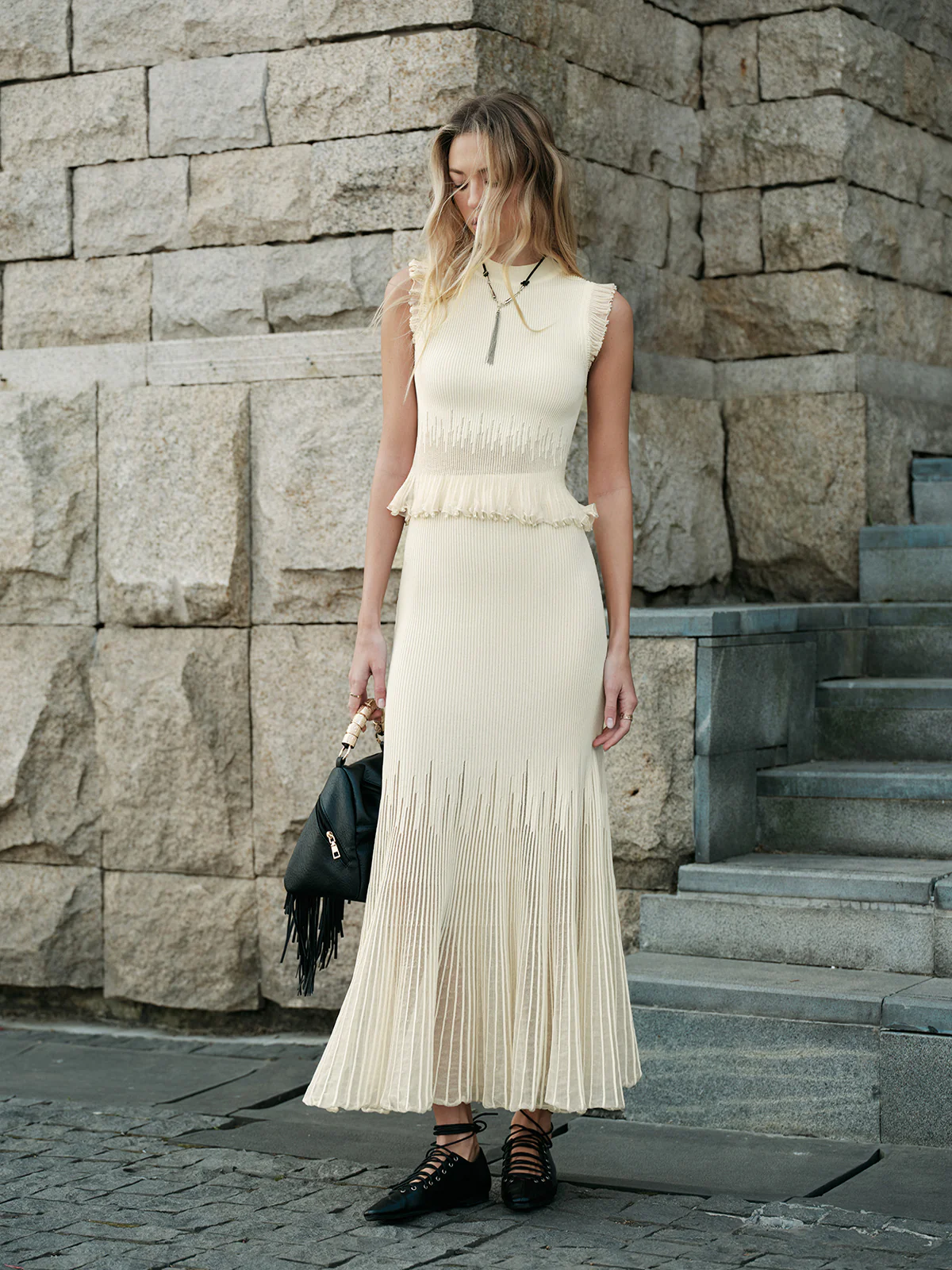 Ribbed Knit Ruffle Top Mesh Panel Pleated Skirt Amber Mule